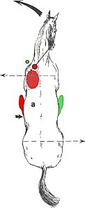- Main droite active (gros rond rouge). Dirigée de droite à gauche en avant du garrot. Ongles au-dessus. - Tension vers la gauche.
