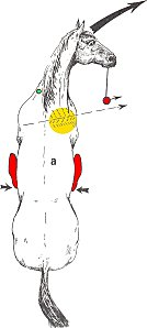 - Deux jambes. Pression égale (en rouge). Ce sont des jambes d’impulsion. Elles amènent le cheval à passer par la porte ouverte par les mains.