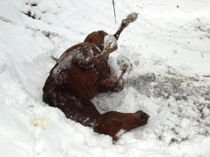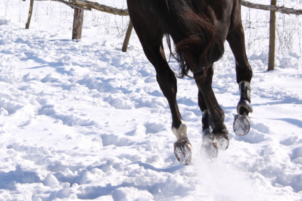 * Dans la neige, les pieds du cheval peuvent s'abîmer. Vérifier que la neige ne s'est pas tassée sous les pieds, formant des blocs de glace. Cela arrive souvent quand les chevaux sont ferrés.