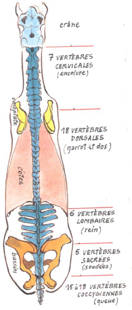 • Le rachis (colonne vertébrale), est constitué de vertèbres séparées par des disques, qui donnent de la souplesse à la colonne vertébrale ; il transmet l'impulsion issue des membres postérieurs.