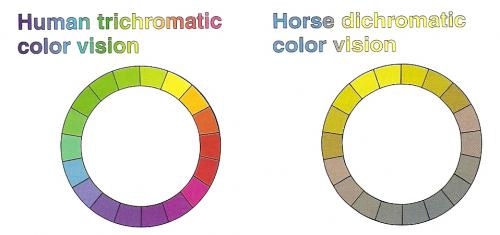 La vision des couleurs est assez limitée chez le cheval: il peut distinguer le jaune et bleu du gris mais difficilement le orange et le rouge.
